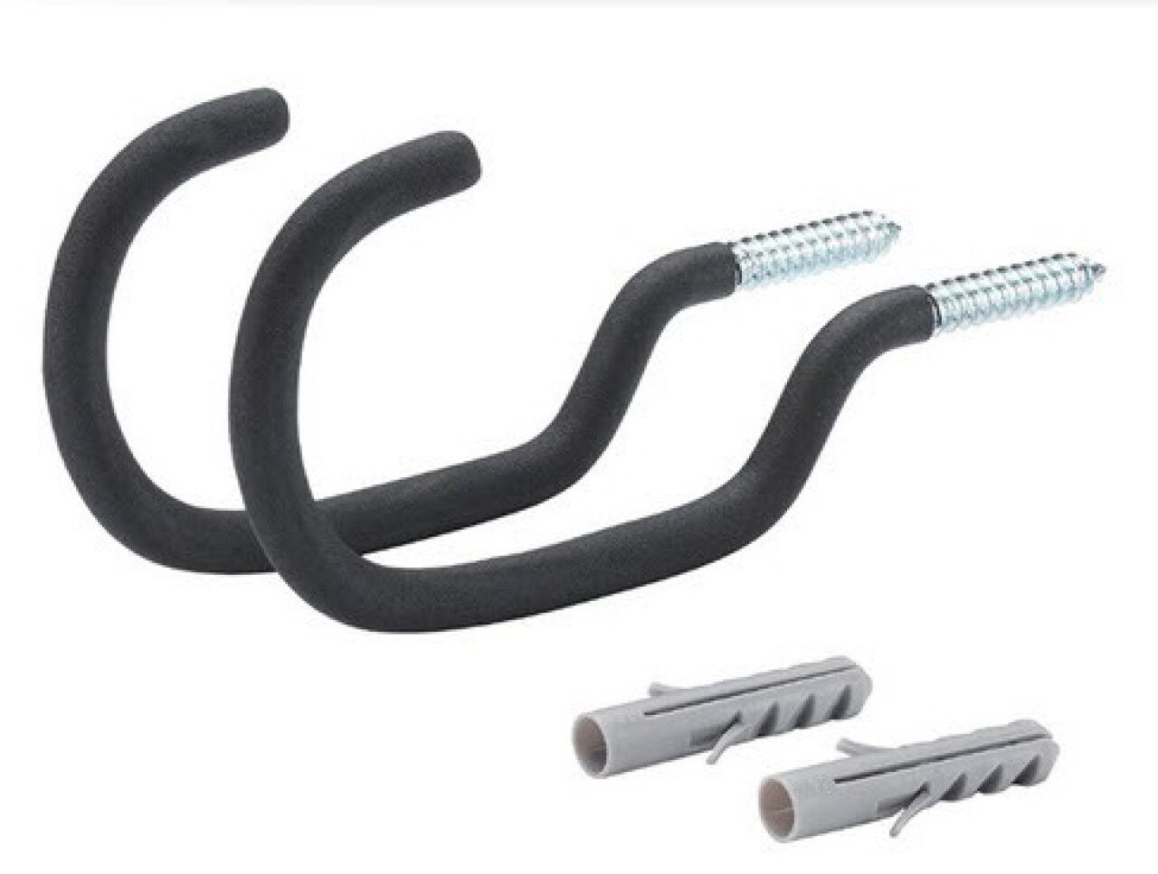 Два крюка с крепежом для хранения велосипеда. Специальное покрытие, защищающее велосипед от царапин. Материал: сталь.