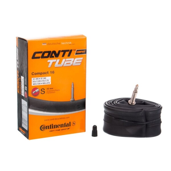Continental Compact - прочная бутилкаучуковая камера для складных и детских велосипедов, а также некоторых самокатов. Обладает размером 16" и, за счет хорошей тягучести резинового состава, внушительным диапазоном ширины - от 1,3" до 1,9". Ниппель FV, рассчитана для установки с ободами под вело ниппель (Presta). Ниппель имеет длину 42 мм, хорошо удерживает давление, резиновый состав устойчив к проколам и легко поддается заклейке. Камера рассчитана на посадочный размер 32/49-305.