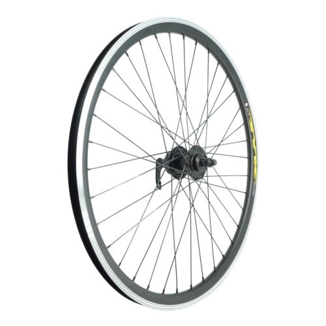 Универсальное переднее колесо в сборе, готовое к установке. Имеет стандартный размер 26". Подойдет для MTB, городских, гибридных, складных и прогулочных велосипедов. Рассчитано для установки в вилки с шириной меду перьями 100 мм. (O.l.d). Втулка оснащена алюминиевым корпусом с 32 отверстиями, насыпными подшипниками, креплением тормозного ротора на 6 болтов. Ось выполнена из стали, фиксируется эксцентриком. Спицы стандартные стальные 2 мм. Обод алюминиевый с двойной стенкой, с тормозной дорожкой под ободной тормоз и индикатором износа, не пистонированный. Оптимальным сочетанием будут покрышки с шириной от 1,75 до 2,25", поддерживает колесо оптимальную нагрузку до 100 кг. Выпускаются колеса в черном цвете обода и втулки с серебристыми спицами. Стоит заметить, что колесо полностью готово к установке, оно собрано и протянуто. В сборку не входят: ободная лента, камера, покрышка и болты для ротора.