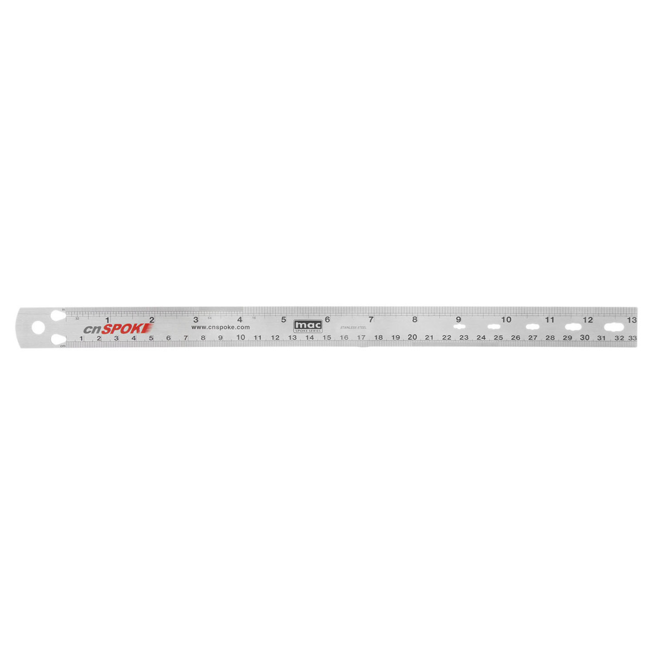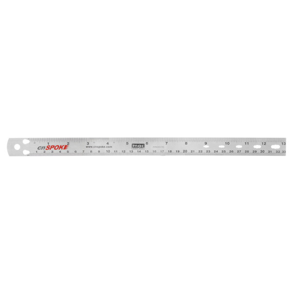 Линейка для точного измерения длины спиц CN Spoke - универсальный и необходимый инструмент для выполнения ремонтных работ с велосипедом в частных и профильных мастерских. Линейка выполнена из нержавеющей стали, лазерная гравировка и фрезеровка отверстий выполнены с высокой точностью. Имеет два стандарта снятия размеров - в миллиметрах и дюймах. Подойдет для определения диаметра шарика насыпного подшипника, размера ниппеля спицы и длины спиц, а также подойдет для прочих замеров.