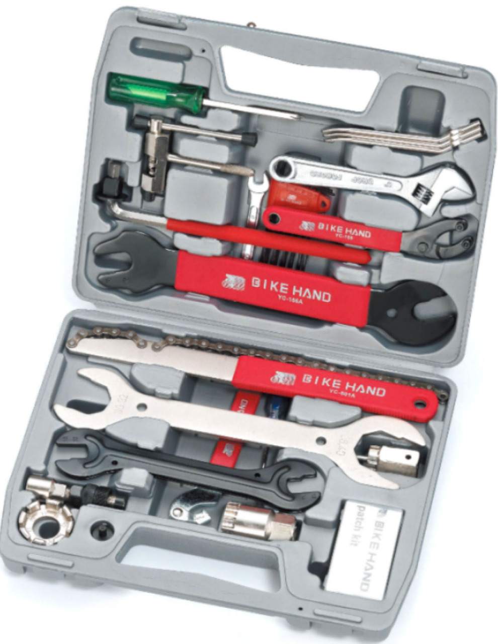 Набор инструмента Bike Hand YC-735A в кейсе состоит из 19-ти инструментов. Набор включает в себя: Отвёртки (YC-611) и (YC-612) Лопатка шиномонтажная (YC-313) Выжимка цепи (YC-329) Ключи: разводной (YC-610); шестигранный (YC-812L); педальный (YC-156A); (YC-501A) для затяжки трещоток; гаечный (YC-151-8-10); конусные - (YC-152); для затяжки колонок рулевых (YC-153); ниппельный (YC-8A); спицевой ключ (10G-15G) Съёмник контргаек и каретки (YC-155) Шестигранники (YC-613) Съёмник каретки (YC-26BB-1A), (YC-157), (YC-126-1A) Рем.комплект (YC-123) Съёмник шатунов (YC-215CB)