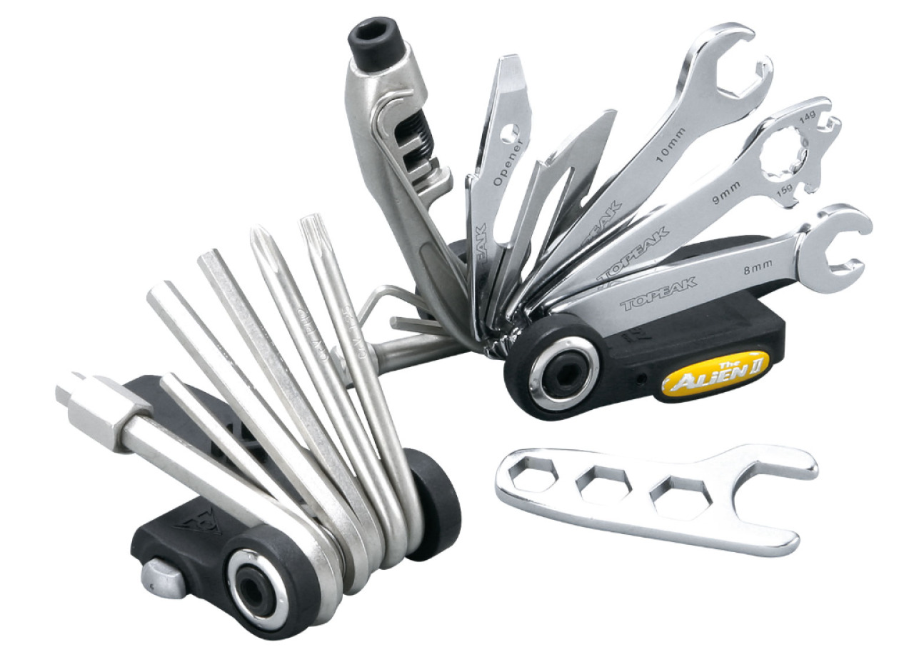 Topeak Alien II - удобный складной мультитул, который станет актуальным в любой ситуации. Мультитул содержит в комплекте 31 инструмент, включая компактную выжимку цепи для 1 -12 скоростей, которая станет отличным дополнением в длительных поездках. Также, помимо выжимки в мультитул входят шестигранники с размерами от 2L до 10 мм, компактные гаечные ключи на 8, 10 и 15 мм, спицевой ключ для спиц 14 и 15G, встроенные в корпус монтажки, шлицевая и крестовая отвертки, измеритель износа цепи, нож, открывашка, педальный ключ, Torx ключ T25, и стандартный торцевой ключ на 9 мм. Вместе с мультитулом в комплекте идет чехол благодаря которому хранение инструмента станет более удобным.