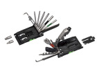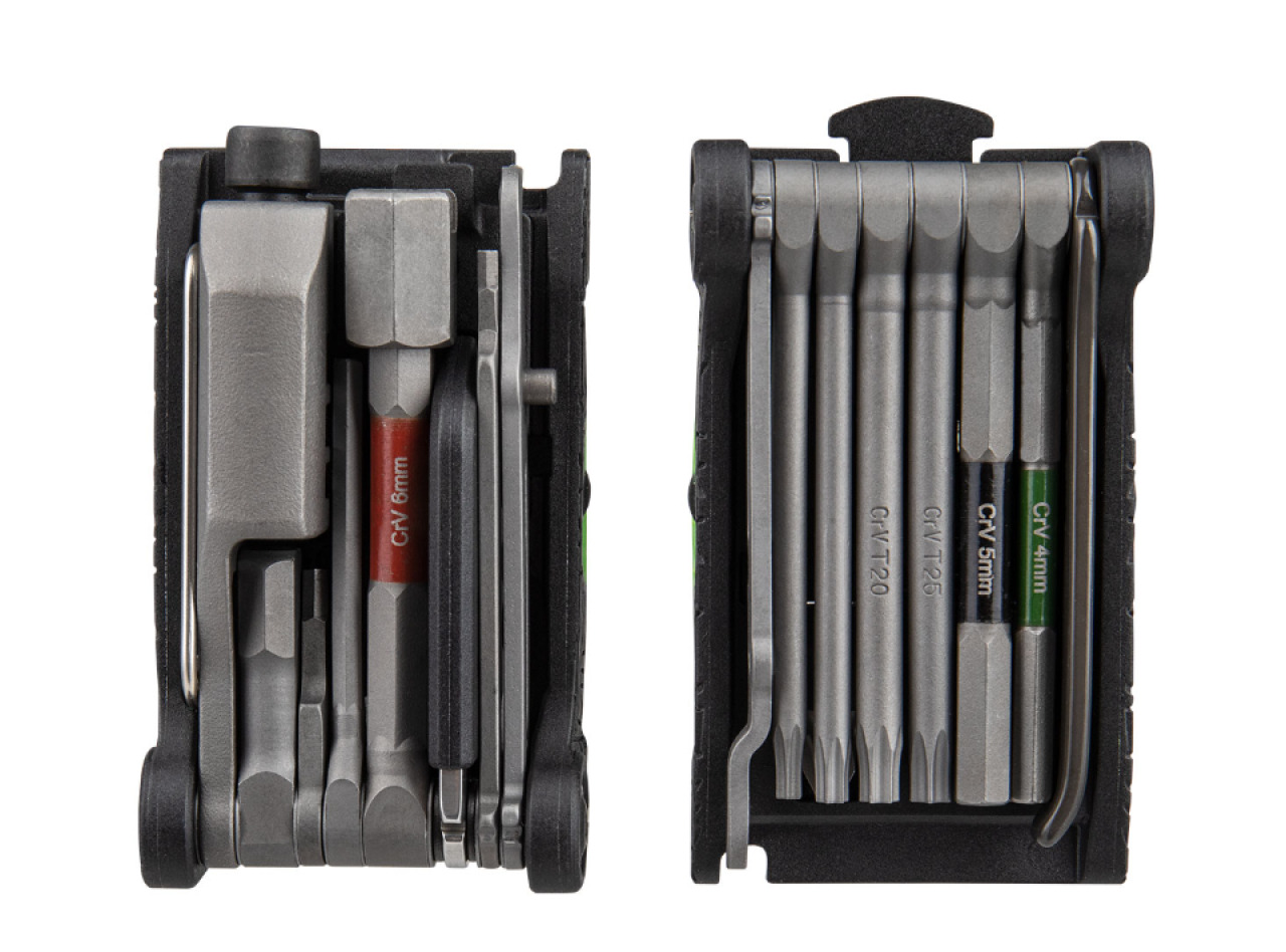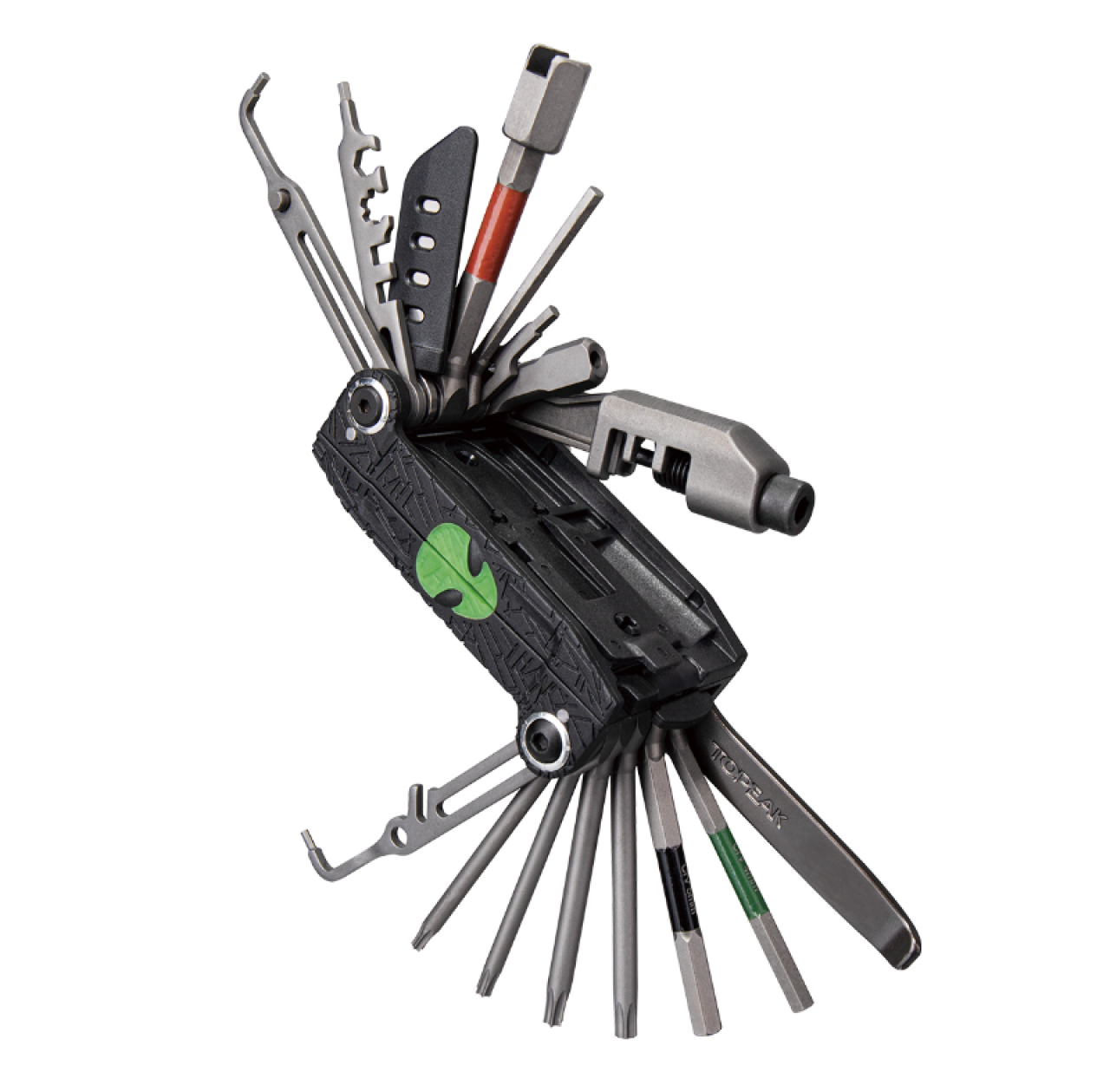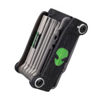 Topeak Alien X - удобный складной мультитул, который станет актуальным в любой ситуации. Мультитул содержит в комплекте 34 инструмента, включая компактную выжимку цепи для 1 -12 скоростей, которая станет отличным дополнением в длительных поездках. Также, помимо выжимки в мультитул входят шестигранники с размерами от 1,5L до 10 мм, компактные гаечные ключи на 8, 10 и 15 мм, спицевой ключ для спиц 14 и 15G, встроенные в корпус монтажки, шлицевая и крестовая отвертки, измеритель износа цепи, нож, открывашка, педальный ключ, Torx ключи размером от T10 до Т30, специальный ключ для ниппелей Presta и стандартный торцевой ключ на 9 мм. Вместе с мультитулом в комплекте идет чехол благодаря которому хранение инструмента станет более удобным.