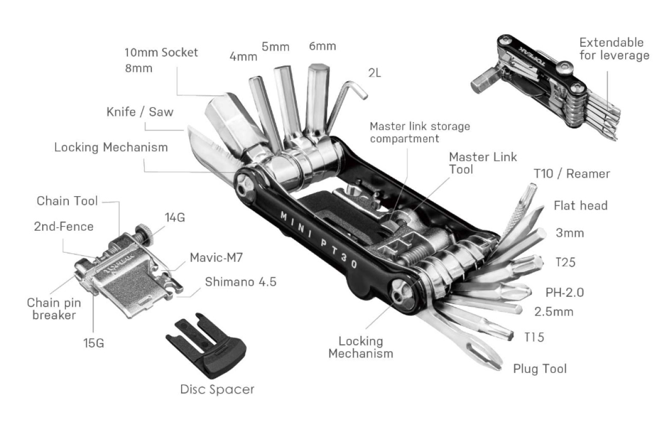 Topeak Ninja Master+ PT30 - универсальный и удобный мультитул для оперативного ремонта велосипеда в дороге. Набор включает в себя 30 инструментов, включая шестигранные ключи с размерами от 2L до 8 мм, Torx-ключи размерами от T10 до T25, а также спицевые ключи стандартных размеров 14 и 15G, крестовую и шлицевую отвертку, выжимку цепи для 1-12 скоростных цепей, инструмент для работы с ниппелями, нож, и монтажки. Дополнительно мультитул комплектуется футляром Toolbox и креплением на раму, за счет чего этот набор инструментов удобно возить с собой.