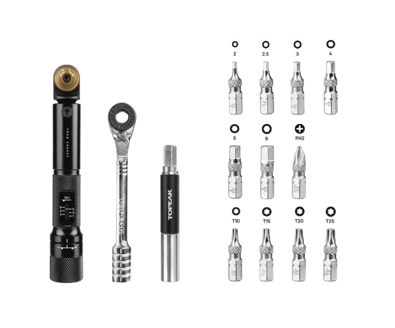 Набор инструментов с трещоткой Topeak Torq Rocket Mini DX - миниатюрный динамометрический ключ с регулируемым крутящим моментом от 1 до 6 Нм и храповой головкой — один из самых компактных инструментов на рынке. Предустановленные значения крутящего момента обеспечивают надёжное и безопасное затягивание болтов рамы и других компонентов. Ключ оснащён стандартной реверсивной храповой головкой с шестигранным приводом, что позволяет быстро вращать и контролировать инструмент в труднодоступных местах. Комплектуется шестигранными битами размерами от 2 до 6 мм, а также Torx-ключами размерами от Т10 до Т25.