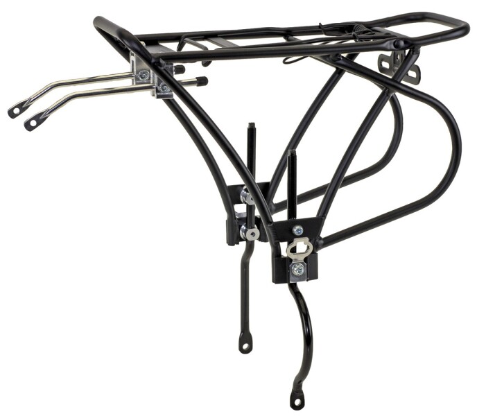 Поставил такой багажник к себе. Минусы: 1. Хоть и написано, что 24-28 дюймов - это не так! С трудом вставал на 26 дюймовые колёса с наклоном вперёд (всё было выдвинуто на максимум). Из-за чего в последствии согнуло вертикальные стойки ниже "треугольника", той точки где три дуги стоек сходятся (далее точка схода ТСх). Поскольку дело было в походе, пришлось создать второй треугольник из палок, ниже ТСх !!! Потерялась жёсткость в продольном направлении, с последующей просадкой, задевающей заднее колесо. Нагружено было примерно 20-25 кг. 2.Много регулировок, что как раз является минусом, у второго участника похода потерялась в пути серебристая тяга, прикрепляющая багажник к подсдельному штырю, снова пришлось крутить палки чтобы не потерять жёсткость в поперченной плоскости. 3. Сложность при установке снятии, из-за многочисленных винтиков, однажды одалживал, запарился снимать. Плюсы: 1. Красивый...