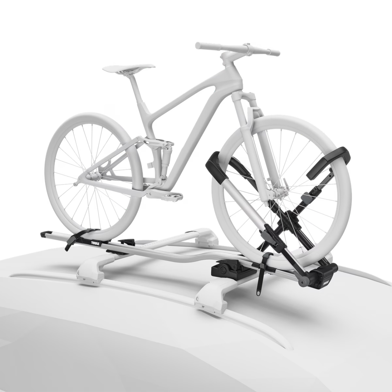 Крепление для перевозки велосипеда на багажнике для крыши автомобиля UpRide 599 от ведущего шведского производителя высококачественных аксессуаров, компании THULE. Крепление устанавливается на фирменный багажник, при помощи четырёх зажимов, которые в свою очередь для полной защиты закрываются на ключ. Велосипед надёжно фиксируется в двух точках – за переднее колесо, без контакта с рамой. Велосипед размещается в специальных колёсных адаптерах (для фэтбайков предусмотрены широкие адаптеры, которые приобретаются отдельно) и притягивается за колёса рычагами замка. Крепление для автобагажника Thule UpRide 599 позволяет перевозить велосипед с диаметром колёс от 20 до 29 дюймов, а также с шириной покрышек до 3 дюймов. Максимальная масса велосипеда 20 кг.