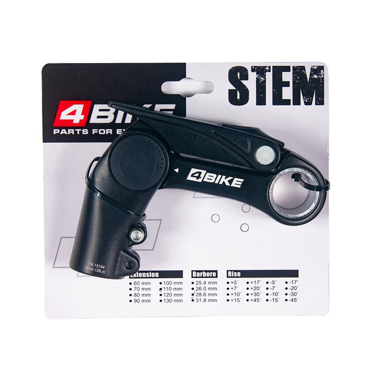 4Bike TDS-C637 - качественная, надежная и функциональная запчасть для велосипеда. Благодаря функции регулировки наклона представляется возможным настраивать геометрию велосипеда, что будет особенно важно для езды по пересеченной местности. Вынос изготовлен из прочного алюминиевого сплава, что отлично влияет на надежность в эксплуатации.
